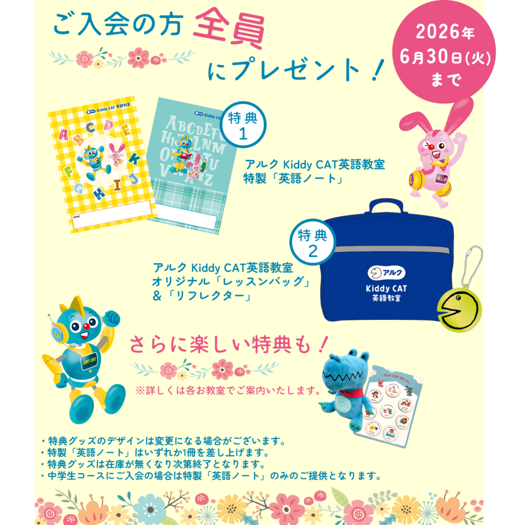 幼児コース、小学生コースにご入会の方全員に英語ノート、レッスンバッグをプレゼント